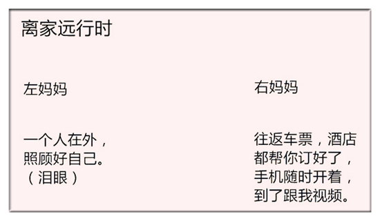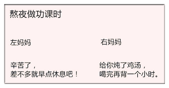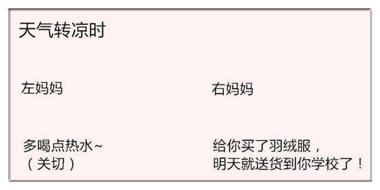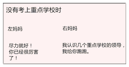 左妈妈和右妈妈代表着两种不同的家教思路,两种教养方法各有裨益,两种教养方法下都培养出过优秀的人才。一种是给孩子宽松的环境,给孩子更多自我做主,自由安排的空间,俗称“放养”;另一种为让孩子少走弯路,直接指给孩子一条家长自以为是的“明路”,更有甚者还要代替孩子走上几步。