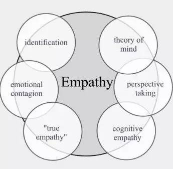 如下图所示,共情的能力由多方面所组成。比如情感识别,有共情能力的人首先要能够识别他人的情绪变化,这种对他人情绪的辨认与理解是社会认知的核心。