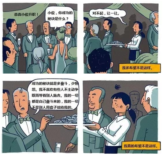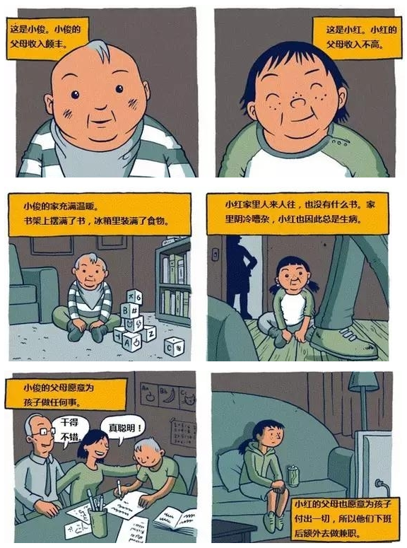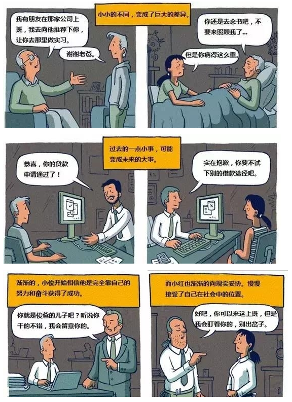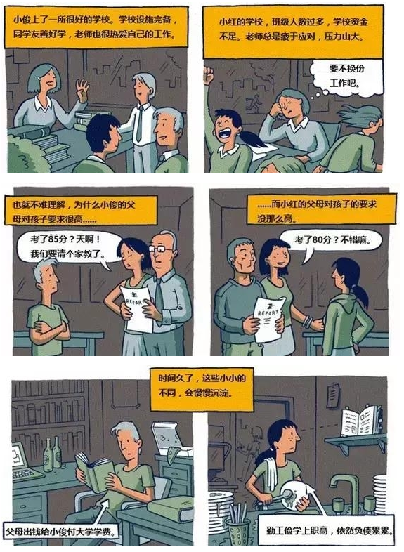 暂且不考虑究竟有多少人能跳出社会等级的既定魔咒成功逆袭,不可否认的是这组漫画从另一个侧面告诉我们一些有趣的规律性的东西。家庭里一点一滴小事,都会积淀成了孩子人生的大事;一个家庭能给孩子人生理想提供多大支撑,决定了孩子的人生方向;成功不仅仅是靠自己努力,更取决于你站在了谁的肩膀上。